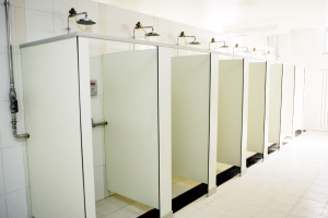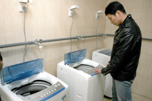 在天津電子信息職業技術學院綜合服務樓的二樓浴室中,換衣區域空間開闊,在洗浴區,用隔板隔出了一個個小單間,並裝有一卡通刷卡機自動控水。該院男女浴室面積各約600平方米,分別可以一次性容納70多人同時洗浴。用水全部由太陽能熱水器加熱,每天可提供熱水30噸,水溫保持在43℃左右。冬季,連接燃氣則會自動加熱。