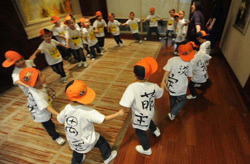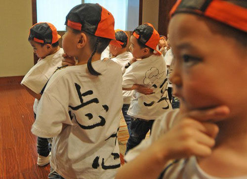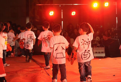 2011年12月30日,天津開發區第一幼兒園迎新年聯歡會舉行,後臺處小朋友們身穿網絡流行語文化衫正在老師的指導下編排舞蹈動作。
